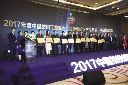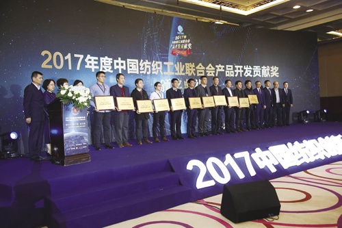 榮譽(yù)時(shí)刻 會(huì)議還舉行了“2017年度紡織十大創(chuàng)新產(chǎn)品”、“2017中國紡織工業(yè)聯(lián)合會(huì)可持續(xù)紡織產(chǎn)品開發(fā)-卓越能效獎(jiǎng)”及“2017中國紡織工業(yè)聯(lián)合會(huì)產(chǎn)品開發(fā)貢獻(xiàn)獎(jiǎng)、產(chǎn)品開發(fā)推動(dòng)獎(jiǎng)”頒獎(jiǎng)典禮。