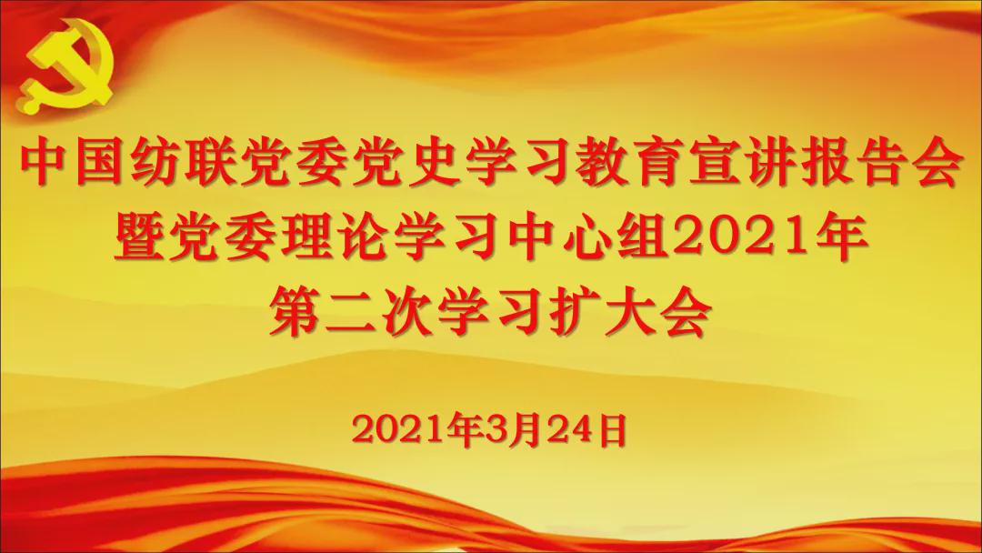 2021年3月24日下午,中國紡聯黨委召開黨史學習教育宣講報告會暨黨委理論學習中心組2021年第二次學習擴大會。按照中央和國資委協會黨建局要求,根據中國紡聯黨委黨史學習教育工作安排,中國紡聯黨委召開了此次會議。